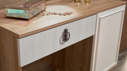 Mesele de toaletă Bellona sunt proiectate pentru a-ți oferi spațiul de depozitare necesar pentru a organiza eficient cosmeticele, bijuteriile și alte accesorii esențiale. Sertarele spațioase, cu glisare silențioasă, îți permit să depozitezi produsele de machiaj, cremele, parfumurile și bijuteriile preferate, menținând ordinea și evitând aglomerația. Compartimentele deschise sunt ideale pentru a expune sticluțele de parfum, cutiuțele cu bijuterii sau alte obiecte decorative.