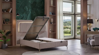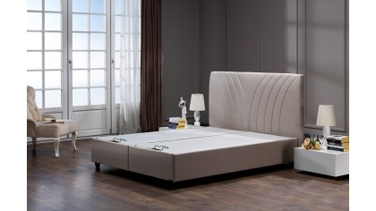 Acest pat tapitat cu lada de depozitare si somiera rabatabila, vine in culoarea gri si cu picioarele de culoare negru.