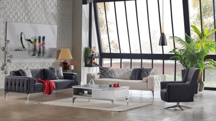 Funcționalitatea nu a fost neglijată: canapelele cu 3 și 2 locuri pot fi transformate rapid în pat, datorită mecanismului tip foarfecă. Fotoliul este conceput pentru a completa perfect setul, având un aspect sportiv și păstrând aceleași detalii de matlasare rafinată.